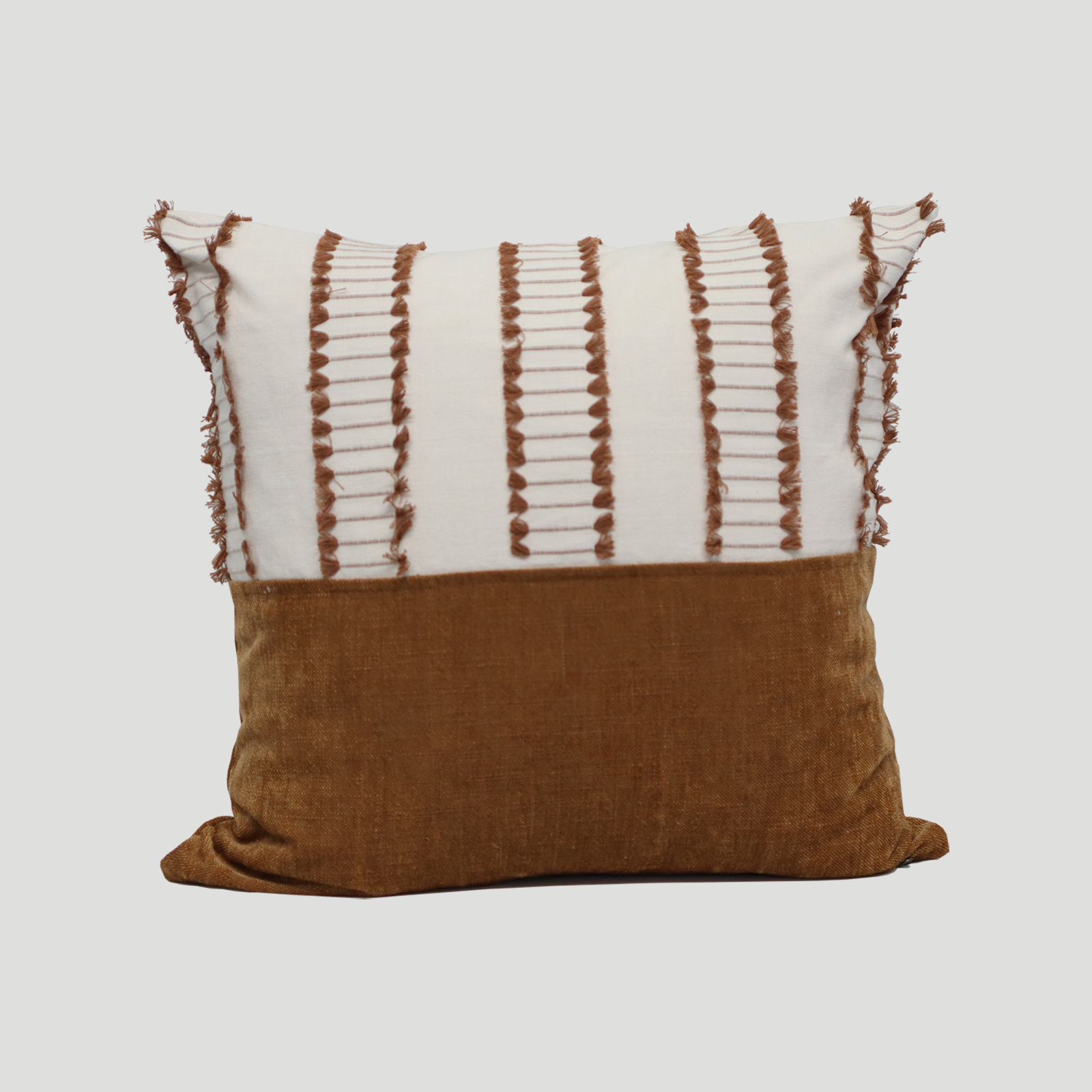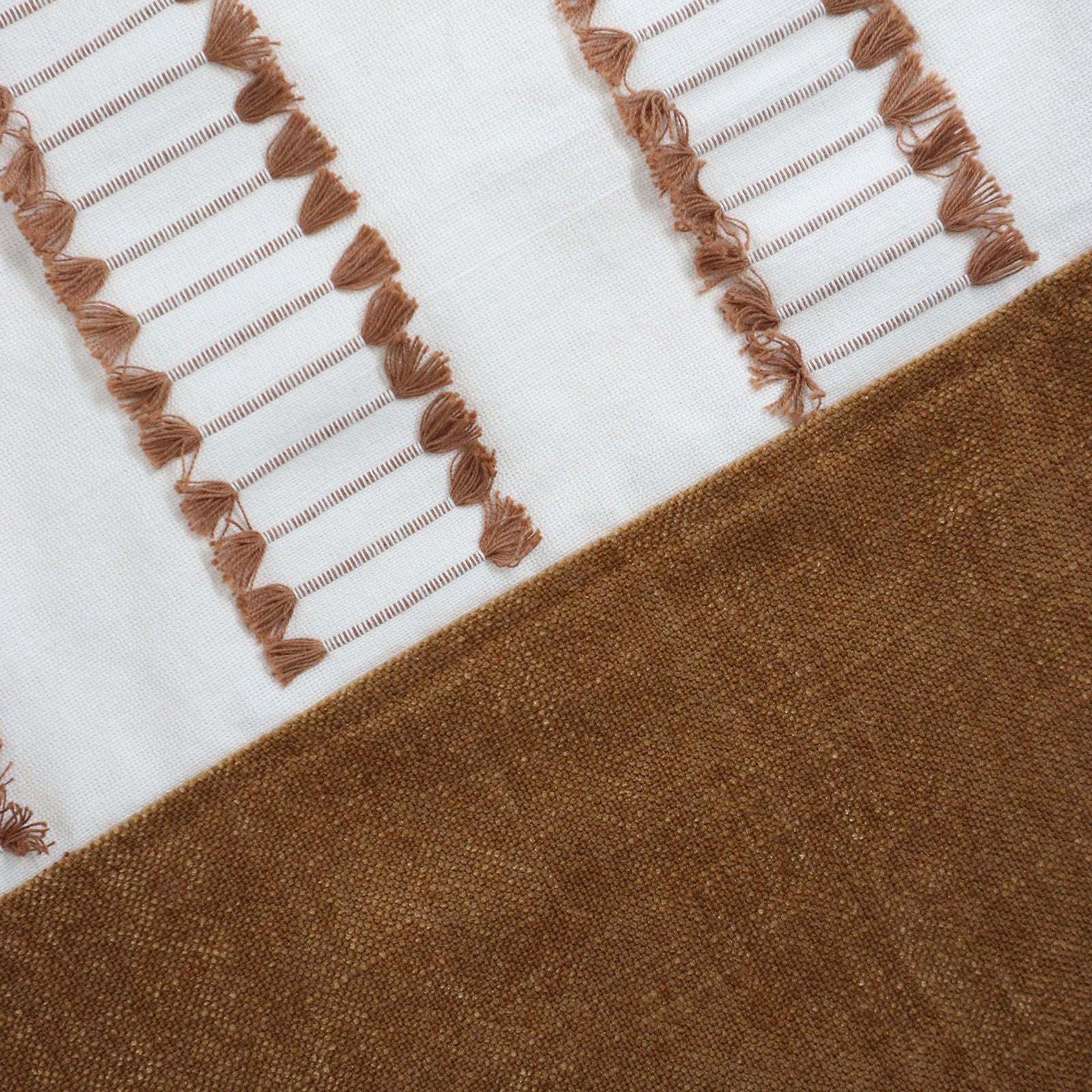 Esla is an elegantly crafted pillow combined of a terracotta chenille, a natural weave, and striped fringe accents.